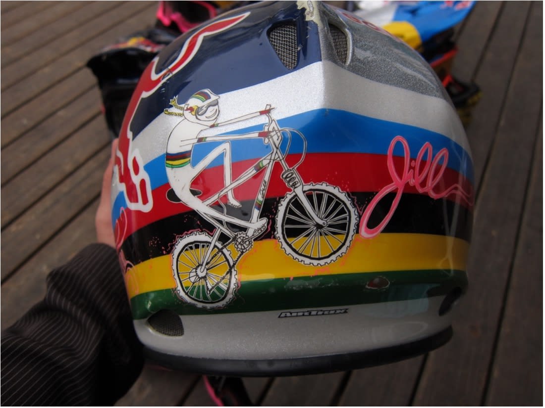 She doodled courses from downhill and enduro races to help her memorise lines and features. Her drawings became the best way for her to communicate her ideas to her sponsors and others in the bike world. This led to her designing her own mountain bike kits and covering her Red Bull helmet with unique doodles.